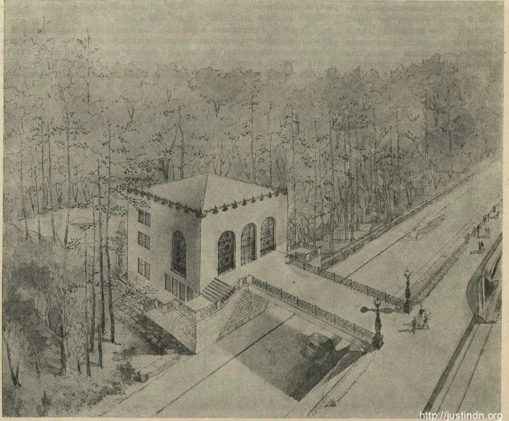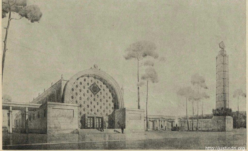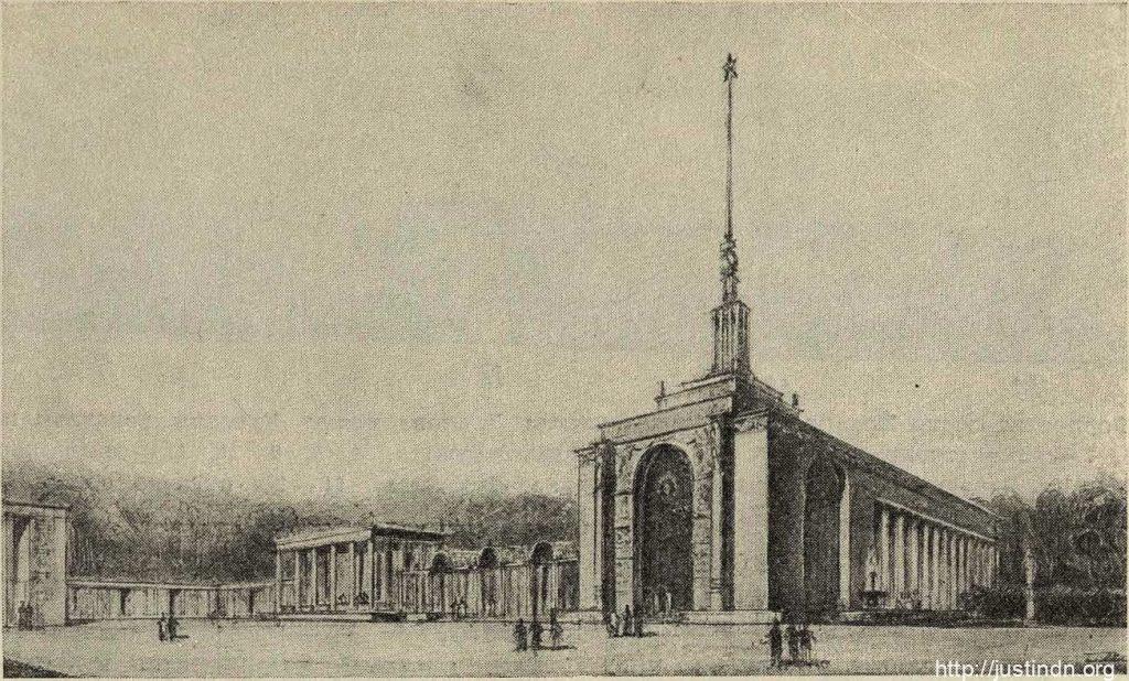 Проект одной из станций Московской ДЖД в Измайловском парке. Справа виден локомотив обтекаемой формы. Рисунок из журнала «Строительство Москвы» №17 за 1940 г.